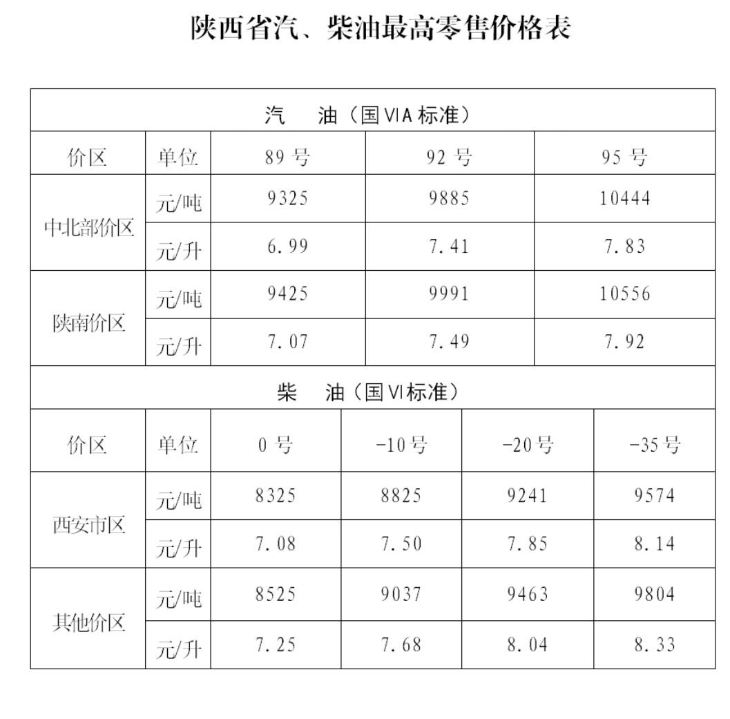 记者从陕西省发展改革委获悉,根据现行成品油价格形成机制,5月31日起陕西省汽、柴油价格相应上调,92号汽油和0号柴油最高零售价格每升均上调0.08元。调整后各价区汽、柴油最高零售价格为:92号汽油西安市场每吨9885元(7.41元/升),中北部价区执行西安市场价格,陕南价区每吨9991元(7.49元/升);0号柴油西安市区每吨8325元(7.08元/升),省内其他市场每吨8525元(7.25元/升)。