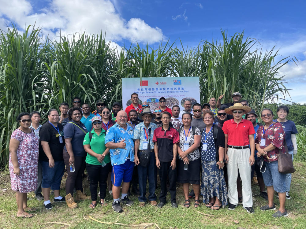 2024年2月28日,来自巴布亚新几内亚、汤加、库克群岛、萨摩亚、瑙鲁等国家的“太平洋岛国菌草技术培训班”学员在斐济布拉阿格鲁菌草技术示范基地合影。新华社发(中国援斐济菌草技术示范中心供图)