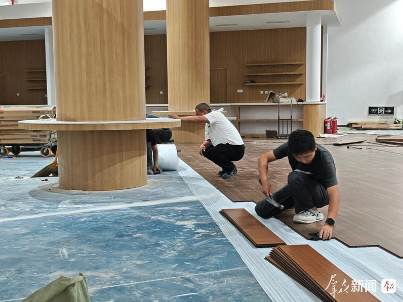 农高会A馆内,工人们正在加紧铺设地板、搭建展台