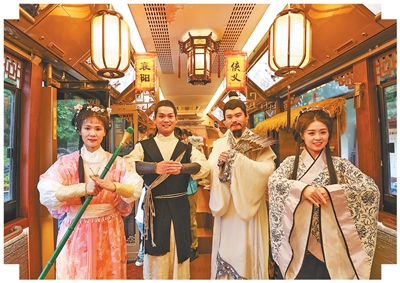 10月5日,湖北襄阳,“黄蓉”“郭靖”“诸葛亮”“黄月英”(从左向右)在“侠义襄阳”旅游公交上与游客互动。杨东 摄(人民视觉)