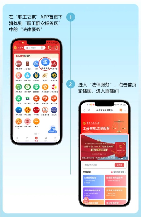 方式2:进入“法律服务”,点击首页【全国工会2025年“宪法宣传周”启动仪式】轮播图,进入直播间。