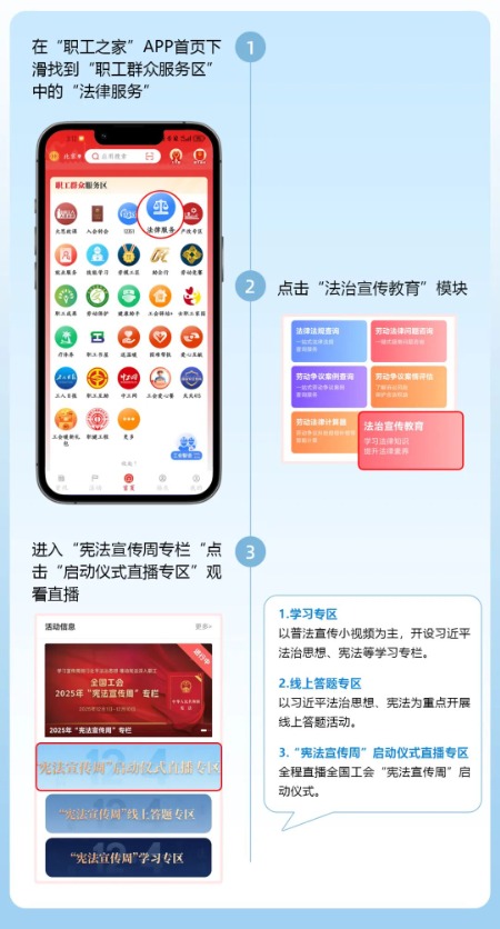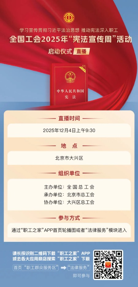 为全面学习贯彻习近平新时代中国特色社会主义思想和党的二十大及二十届历次全会精神,深入学习宣传习近平法治思想、中央全面依法治国工作会议精神,认真落实习近平总书记关于工人阶级和工会工作的重要论述,响应中央宣传部、司法部、全国普法办《2025年全国“宪法宣传周”工作方案》要求,在全社会营造尊法学法守法用法的浓厚氛围,由全国总工会主办、北京市总工会承办、大兴区总工会协办的全国工会2025年“宪法宣传周”启动仪式,于2025年12月4日(周四)上午9:30在“职工之家”APP“法律服务”模块、全国总工会视频号进行直播。