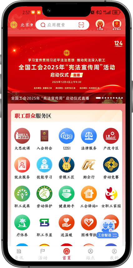 方式1:点击“职工之家”APP“首页【全国工会2025年“宪法宣传周”启动仪式】轮播图,收看直播。