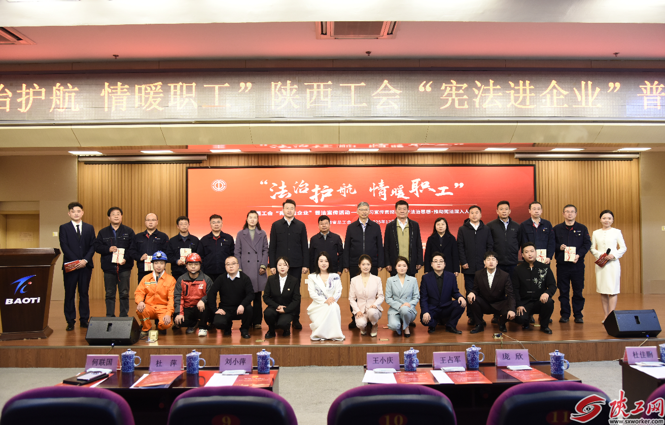 陕工网讯 12月4日,第十二个国家宪法日当天,由陕西省总工会主办,省机械冶金建材工会、宝鸡市总工会协办的“法治护航·情暖职工”陕西工会“宪法进企业”普法宣传活动在宝钛集团宝钛宾馆七楼学术报告厅举行。