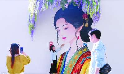 位于西安市灞河东岸锦堤五路的一处工地围墙,因可爱的小狗、带花的少女、飘动的气球等彩绘图案而走红网络。4月17日,记者在这里看到,不少市民前来打卡拍照。本报全媒体记者 刘强 摄影报道