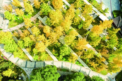 近日,在汉中市天汉湿地公园音乐喷泉广场附近,偌大的一片银杏林铺展成金色画卷,在阳光下泛着温暖光泽。
