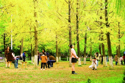 11月1日,渭南市区朝阳公园里大片的金黄色银杏树叶,吸引了众多市民打卡拍照,共赏秋色。