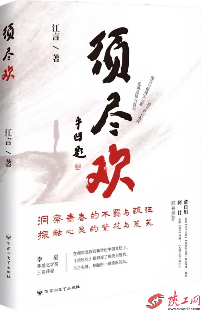 陕工网讯(全媒体记者 兰增干)近日,我省青年作家江言新作——超现实主义长篇小说《须尽欢》由南昌百花洲文艺出版社正式出版发行。该书由著名作家贾平凹题写书名,并获得著名导演阿甘、俞白眉等文化名人的重磅推荐。