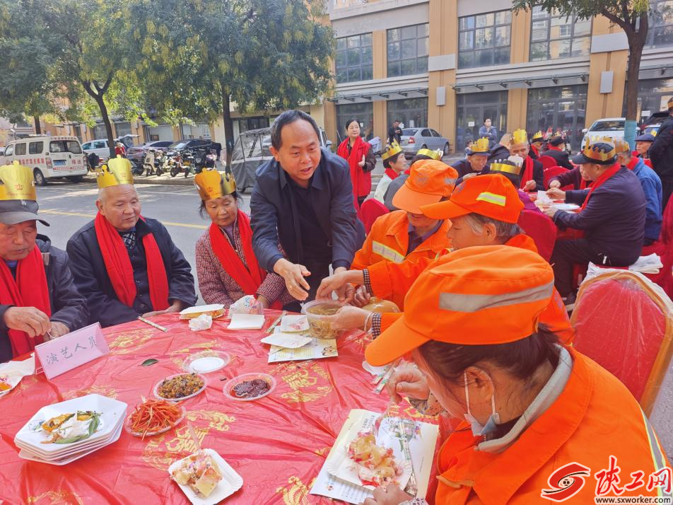 表彰结束后,活动进入温馨的互动环节。社区工作人员与志愿者们一同推出精心定制的重阳蛋糕,邀请老年职工代表共同切开,寓意“福寿安康、甜蜜团圆”。随后,热气腾腾的臊子面陆续端上桌,一碗碗饱含关怀的暖心美食,让老人们吃得暖心又暖胃。现场,志愿者还为行动不便的老人提供贴心服务,陪老人聊天、送祝福,整个活动现场洋溢着浓浓的亲情与温情。
