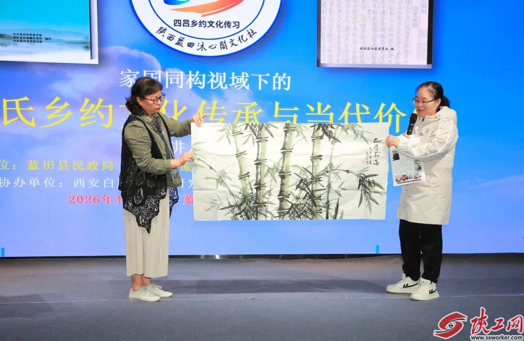 活动尾声,为感谢主讲老师的倾情分享,沐心阁文化社荣誉社长、陕西省美协会员刘家乐老师,向瞿社长赠送了国画竹子《品清节高》,以笔墨寄情,既彰显了对瞿社长深耕乡约文化、传承本土文脉的敬意,也借竹子“清雅高洁”的寓意,传递乡约文化的精神内核。随后,主办方为现场听众赠送了吕氏乡约相关书籍,以具象化、常态化的方式延续讲座效用,进一步传递乡约文化的精神力量。秘书长王小玉女士代表主办方再次致谢,感谢各位指导单位、协办单位的支持,感谢社长的倾情分享,以及各位听众的积极参与,并表示沐心阁文化社将持续发力,深耕本土文化,开展更多形式多样的文化活动,推动吕氏乡约文化的挖掘、传承与践行。最后,全体参与者合影留念,定格下这场意义非凡的文化相聚,为本次专题讲座画上了圆满句号。