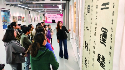 11月6日至11日,由省总工会主办,西安市总工会承办的“中国梦·劳动美”庆祝中华全国总工会成立100周年陕西省职工书法美术摄影作品展,在西安市职工文化艺术交流展示中心展出。图为参观者在工作人员讲解下鉴赏参展作品。