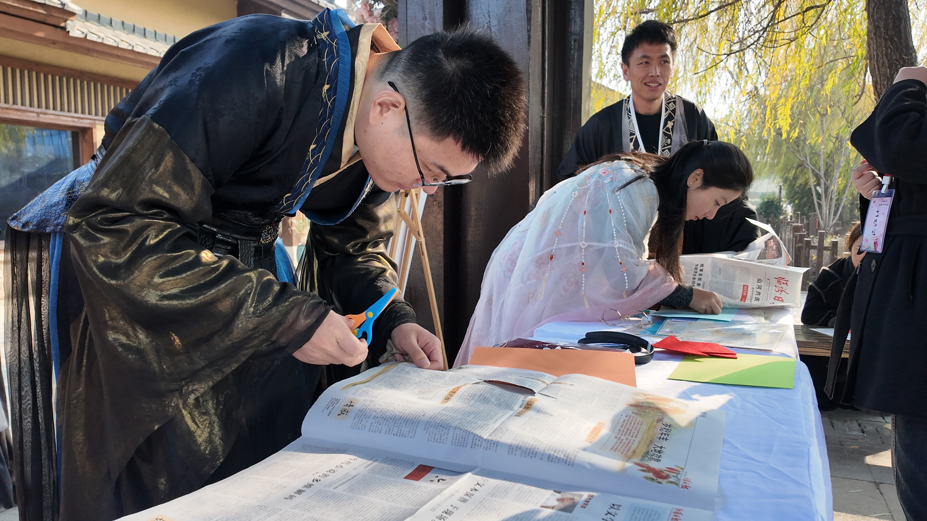 午餐后,参与者换上汉服,开启传统元素与现代交友形式巧妙相融的主题游园活动。非遗漆扇、糖葫芦制作、拼贴诗、套圈等互动摊位前,青年们结伴参与、协作体验。在非遗漆扇体验区,几位青年合力完成纹样雅致的作品,在指尖传递中增进了情谊。