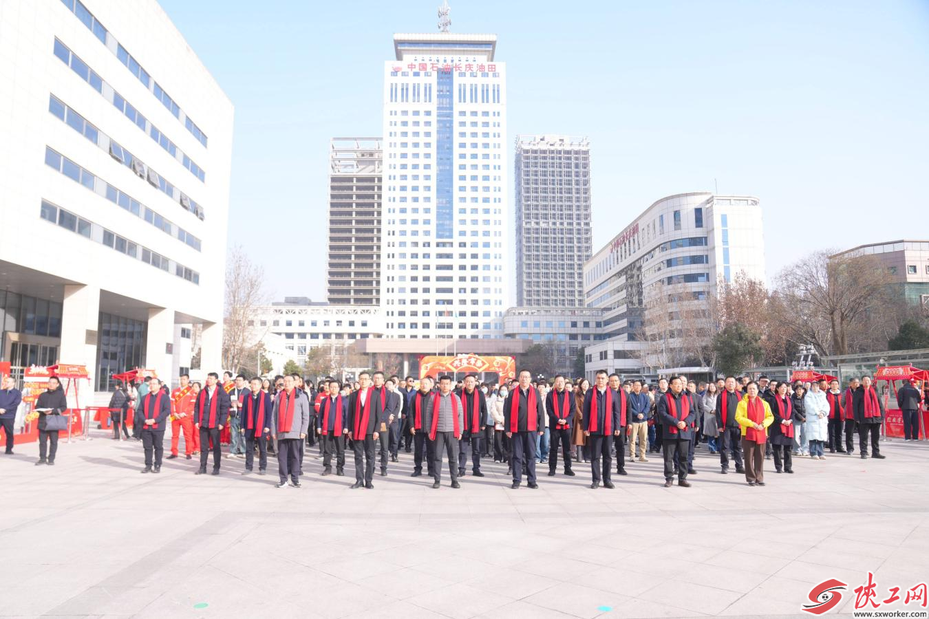 陕工网讯(李若斌)金龙辞岁,福马迎春。2月12日,长庆油田公司迎新春“送万福进万家——致敬劳动者”兴隆市集在长庆科技楼广场举行。长庆油田公司执行董事、党委书记李战明,陕西省能源化学地质工会主席庄华章出席活动。