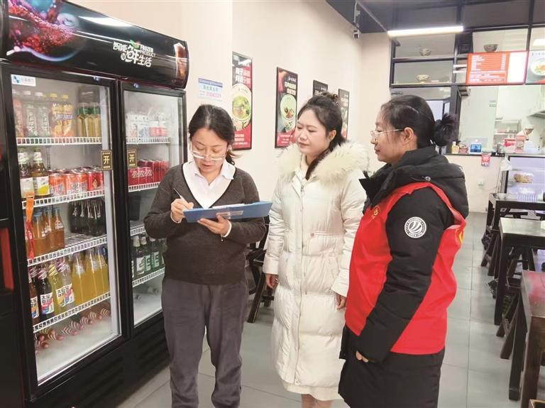 王旭(中)走访社区商户。