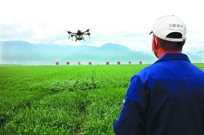③4月12日,西安市长安区长丰农机合作社技术人员在神禾塬万亩优质粮食生产基地,利用大型无人机进行“一喷三防”春季田间管理,确保今年小麦丰产丰收。