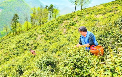 ②4月11日,在旬阳市红军镇千亩茶园里,村农正在采茶。近年来,该镇大力发展茶产业,带动周边群众实现家门口就业增收。