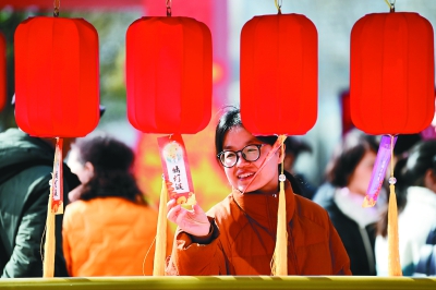 2月7日,游客参与猜灯谜游戏。当日,2026年西安市“我们的节日·春节”主题示范活动举行,融合非遗体验、民俗展演、年货市集、互动游戏等多种形式,为即将到来的新春佳节营造出浓浓的节日氛围。