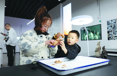 二月十二日,春节来临之际,秦始皇帝陵博物院精心打造的“凝眸:凝望·望远·远眸——文物科技保护成果展”启幕。图为小朋友体验文物修复。