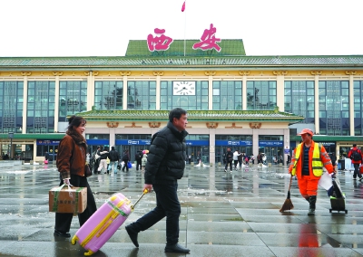 2月23日,旅客从西安站前经过。