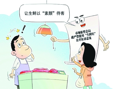 文/图 王琪 近日,市场监管总局发布公告,就严禁使用“生鲜灯”公开征求意见。公告不仅重申须使用不影响感官认知的白光光源,更将禁令延伸至有色灯罩、有色塑料袋甚至有色背景板,并禁止照明商家以