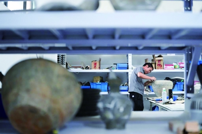 工作人员在陕西省考古研究院秦汉考古基地修复秦咸阳城遗址出土文物。