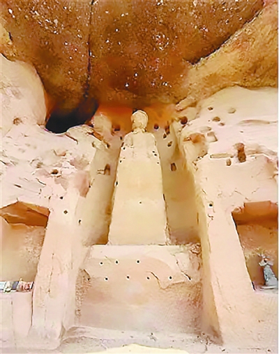 造像也是悟空洞的重要文化遗存。大室南侧曾有一尊高6.3米、肩宽1.3米的巨型石像,带有凹式舟形背光,自像座延伸至石罅,像躯及背光上还凿有方形或圆形小孔,可惜在1966年遭到损坏,如今仅能看到大概轮廓。离巨型石像不远处的“立佛龛”中,一尊高约4米的立佛依山体而建,虽双手残断、面部风化严重,且肩膀及头顶有后代重修时敷打的少量泥,但从其比例、动势、衣饰风格来看,庄严神圣之感丝毫不减。这尊立佛与龙门石窟宾阳中洞立佛、甘肃庆阳北石窟寺165窟立佛等相似,专家推断其为北魏后期至西魏之作。此外,立佛附近还有两个面积仅一平方米左右的平顶方形小窟,内供一佛二菩萨造像,与旬邑县黑牛窝石窟一致,应为北朝时期遗存,为研究悟空洞的创建提供了重要依据。