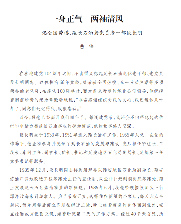 您当前的位置:首页 > 文化 > 文学 征文|一身正气 两袖清风 ——记全国劳模、延长石油老党员老干部段长明