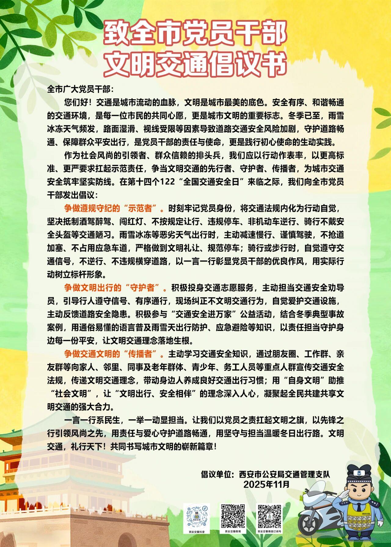 三秦都市报-三秦网讯(记者 李佳)在第十四个122“全国交通安全日”来临之际,西安市公安局交通管理支队向西安全市党员干部发出倡议:希望大家争做遵规守纪的“示范者”;争做文明出行的&ldquo