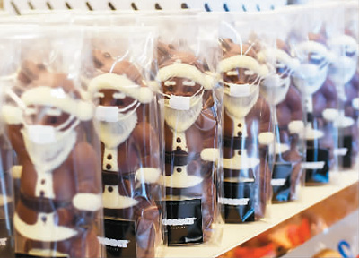 随着圣诞节临近,德国法兰克福在当地一些街头装饰品和圣诞食品的造型设计中加入了抗疫元素。图为11月25日在一家糕点店内拍摄的戴口罩的圣诞老人造型巧克力。 新华社记者 逯 阳摄