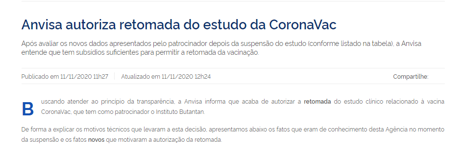 巴西国家卫生监督局声明截图 人民网北京11月12日电(符园园 鲁扬)当地时间11月11日,巴西国家卫生监督局宣布授权恢复北京科兴中维生物技术有限公司研发的新冠疫苗CoronaVac临床试验。 该机构在声明中表示