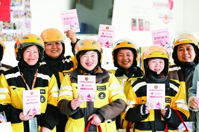 2025年3月7日,在山东省临沂市郯城县郯城街道龙泉社区,外卖女骑手展示妇联发放的妇女维权公益服务知识手册。