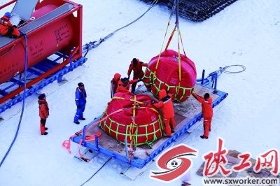 北京时间12月3日凌晨,工作人员在“雪龙2”号船侧冰面开展油囊装车作业。 近日,正在执行中国第42次南极考察任务的“雪龙”号抵达南极中山站外围陆缘冰。“雪龙2”号已于北京时