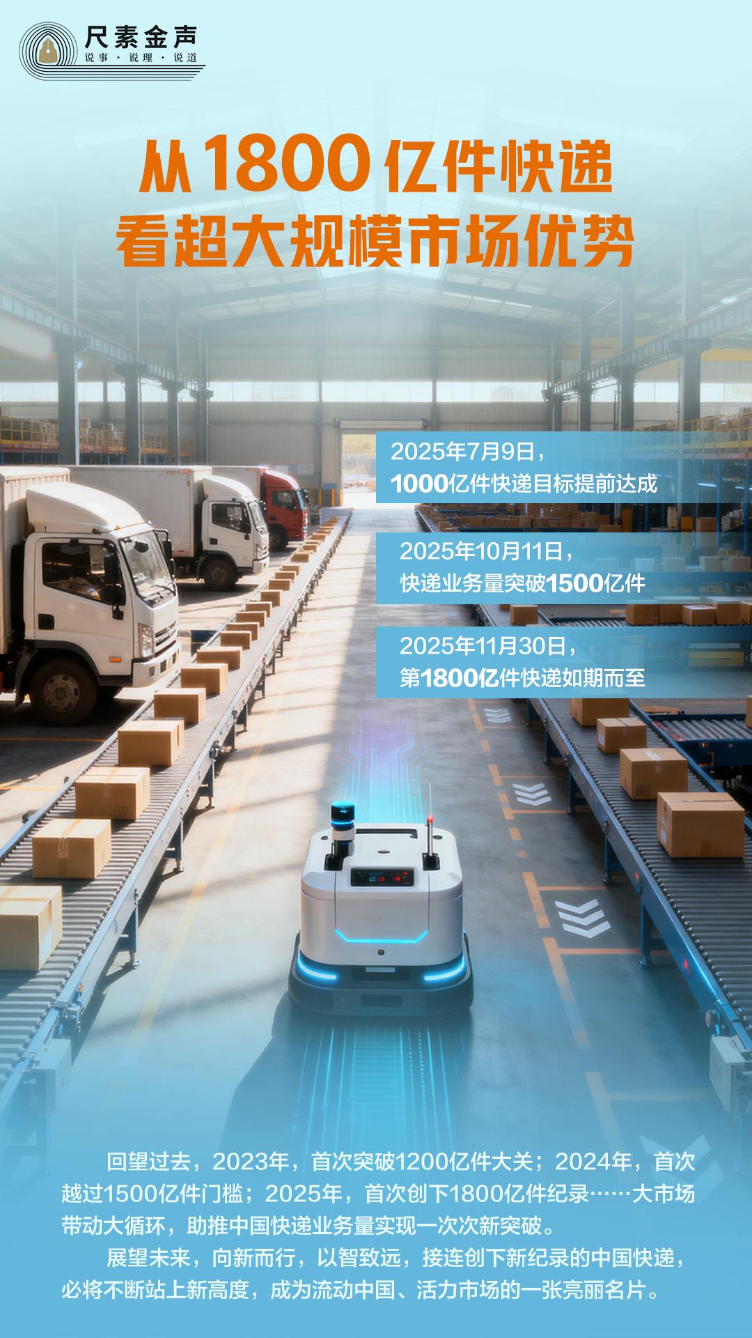 首次突破1800亿件! 11月30日,国家邮政局快递大数据平台,一长串数字变换的短暂一瞬,中国快递业务量创下历史新纪录。 快递连接千城百业、联通线下线上,是反映经济活力的“晴雨表”,释放出超大