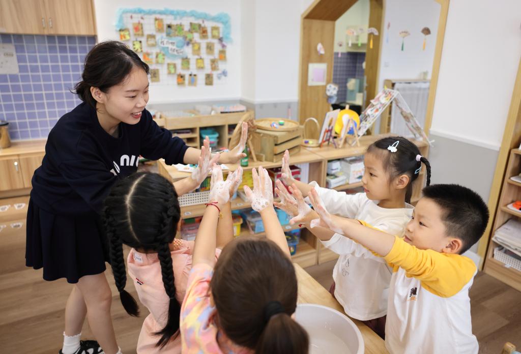 浙江省诸暨市越都幼儿园的老师在指导小朋友正确洗手。新华社发(郭斌摄)
