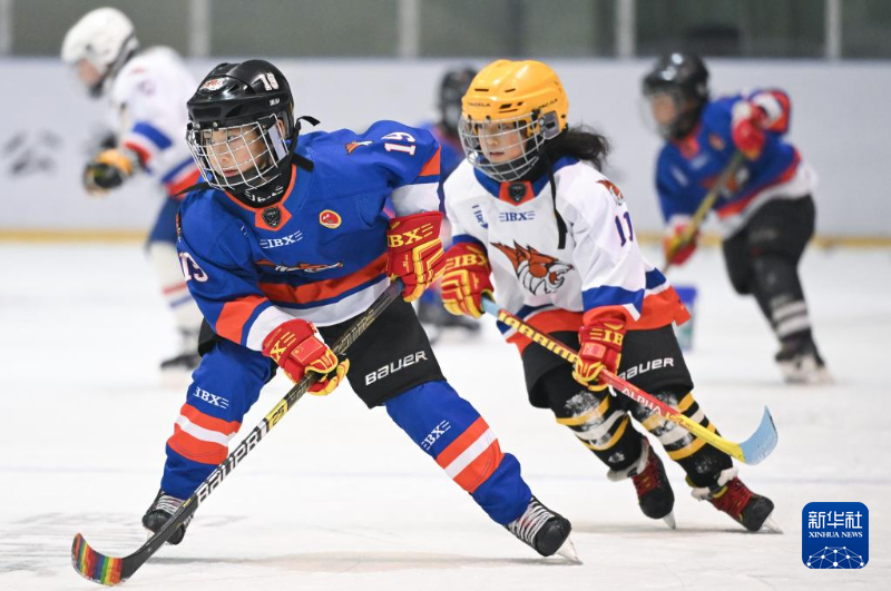 1月25日,在齐齐哈尔市的黑龙体育馆内,二马路小学翼虎冰球队队员刘金梓晨(左)在训练中。新华社记者 张涛 摄