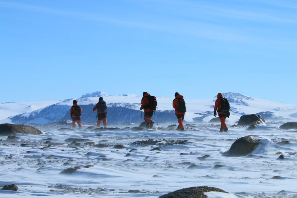 资料图片:北京师范大学教授张雁云作为中国第34次南极考察队队员在恩克斯堡岛与队友们行进,开展企鹅及栖息地研究。(受访者供图)