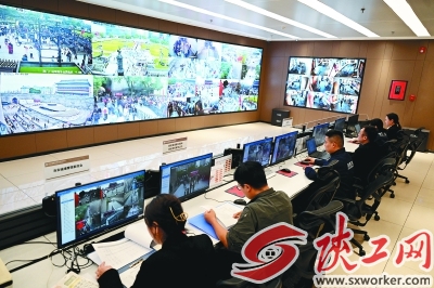 10月2日,西安城墙管委会信息中心的工作人员通过西安城墙数字方舱综合管理平台监看景区实况。
