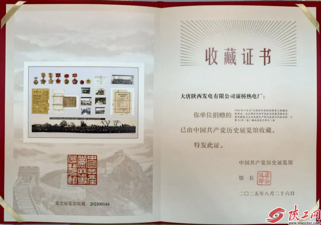 陕工网讯 近日,灞桥热电厂收到中国共产党历史展览馆寄来的收藏证书,标志着该厂捐赠的13件(套)物品及1张电子照片,正式被该馆收藏。这些珍贵藏品既承载着该厂发展历程中的重要记忆,也折射出我国电力事业的发展变迁。国家的收藏与认可,不仅是对该厂历史价值的肯定,更是对电力事业文化传承的鼓励与鞭策。