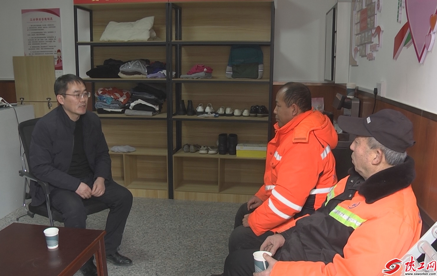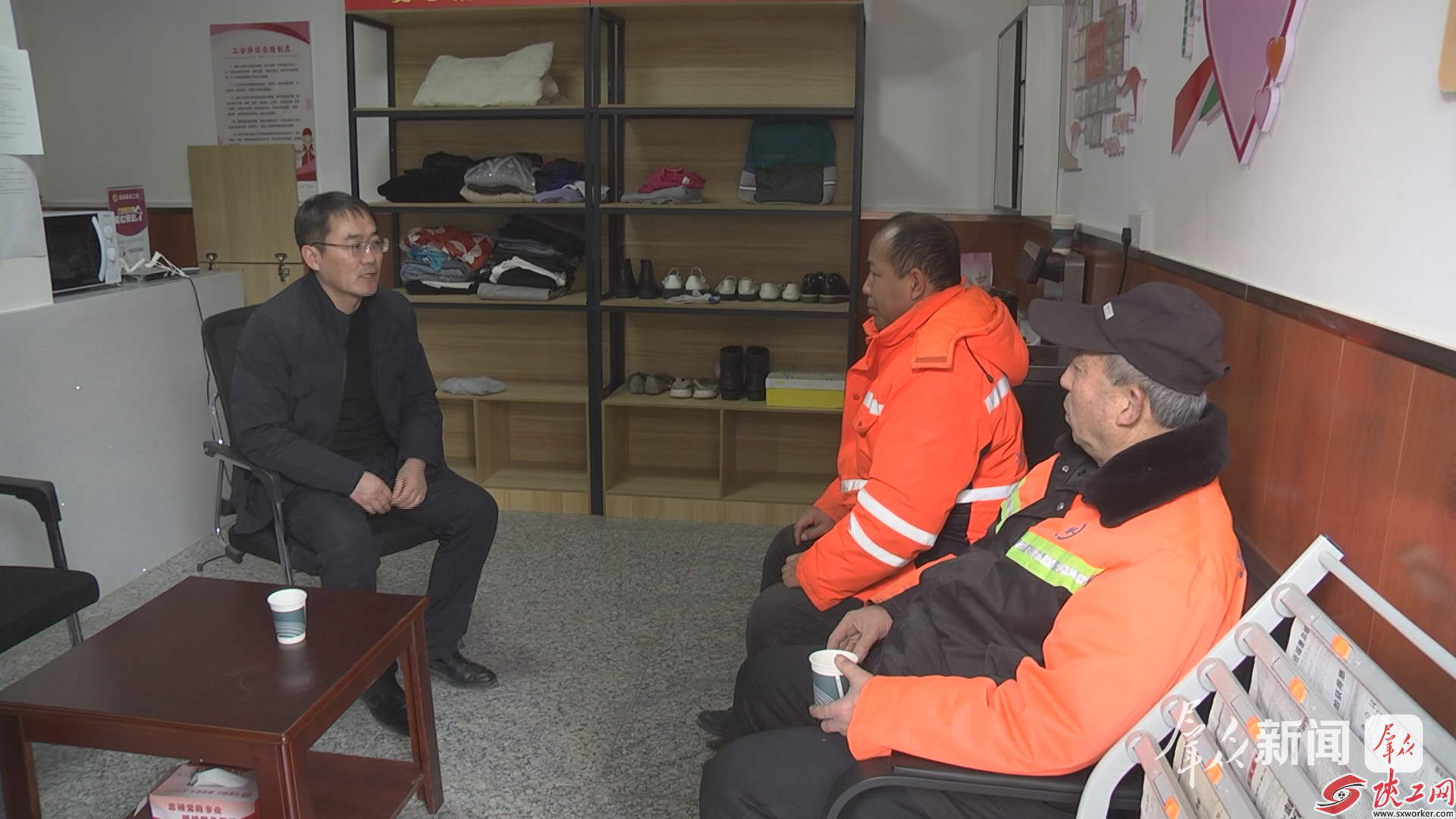 2月20日,在清涧县总工会爱心驿站,刘波(左)为前来休息的环卫工人提供咨询服务。通讯员 邓聪摄