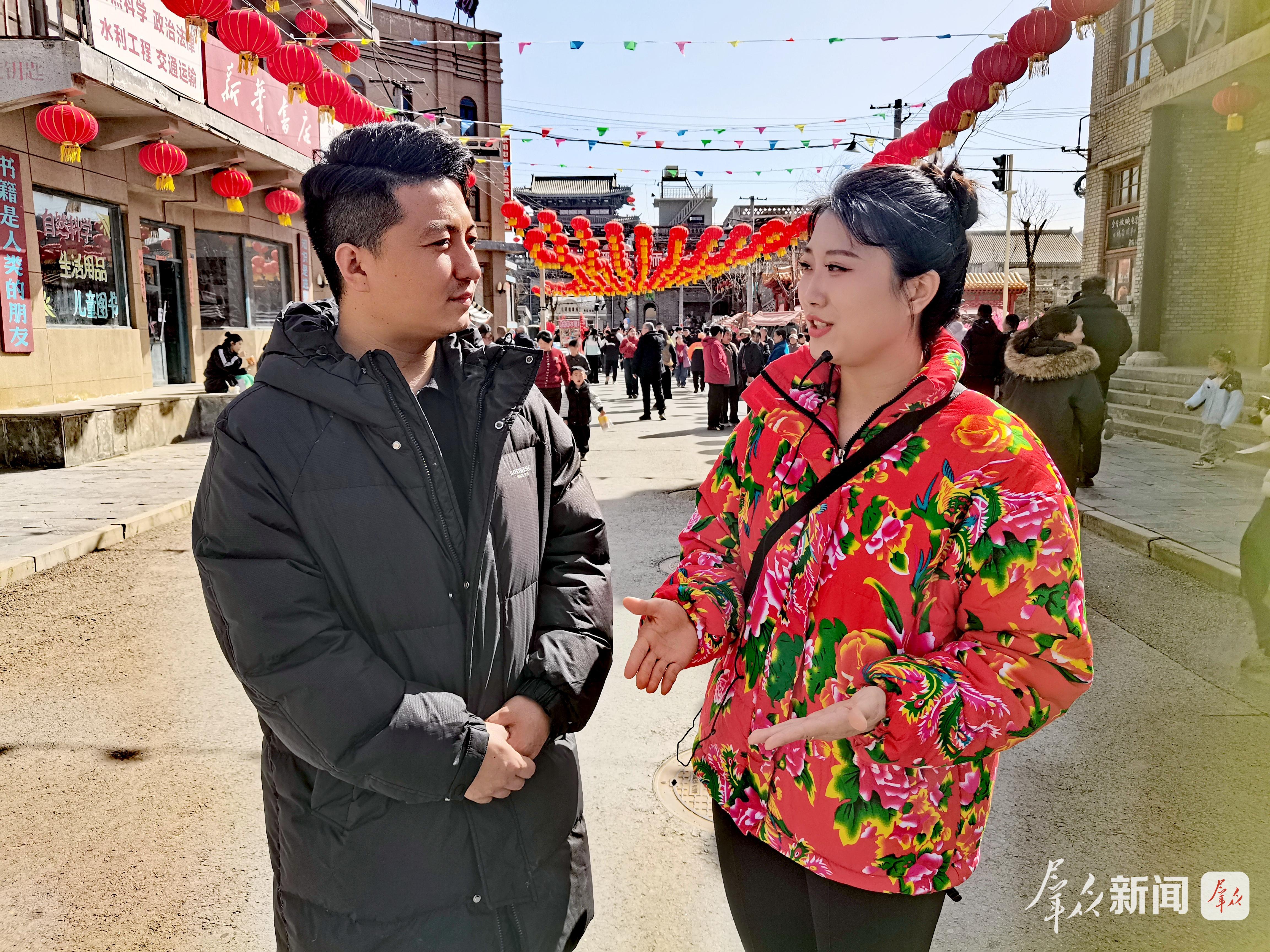 春节假期,影视城每天活动开始前10分钟,和刘莹一样的讲解员,都会提前把欢迎词默念几遍。喜庆鲜红的大棉袄一穿、扩音器往腰间一别,迎接游客的是满满的祝福与笑容。
