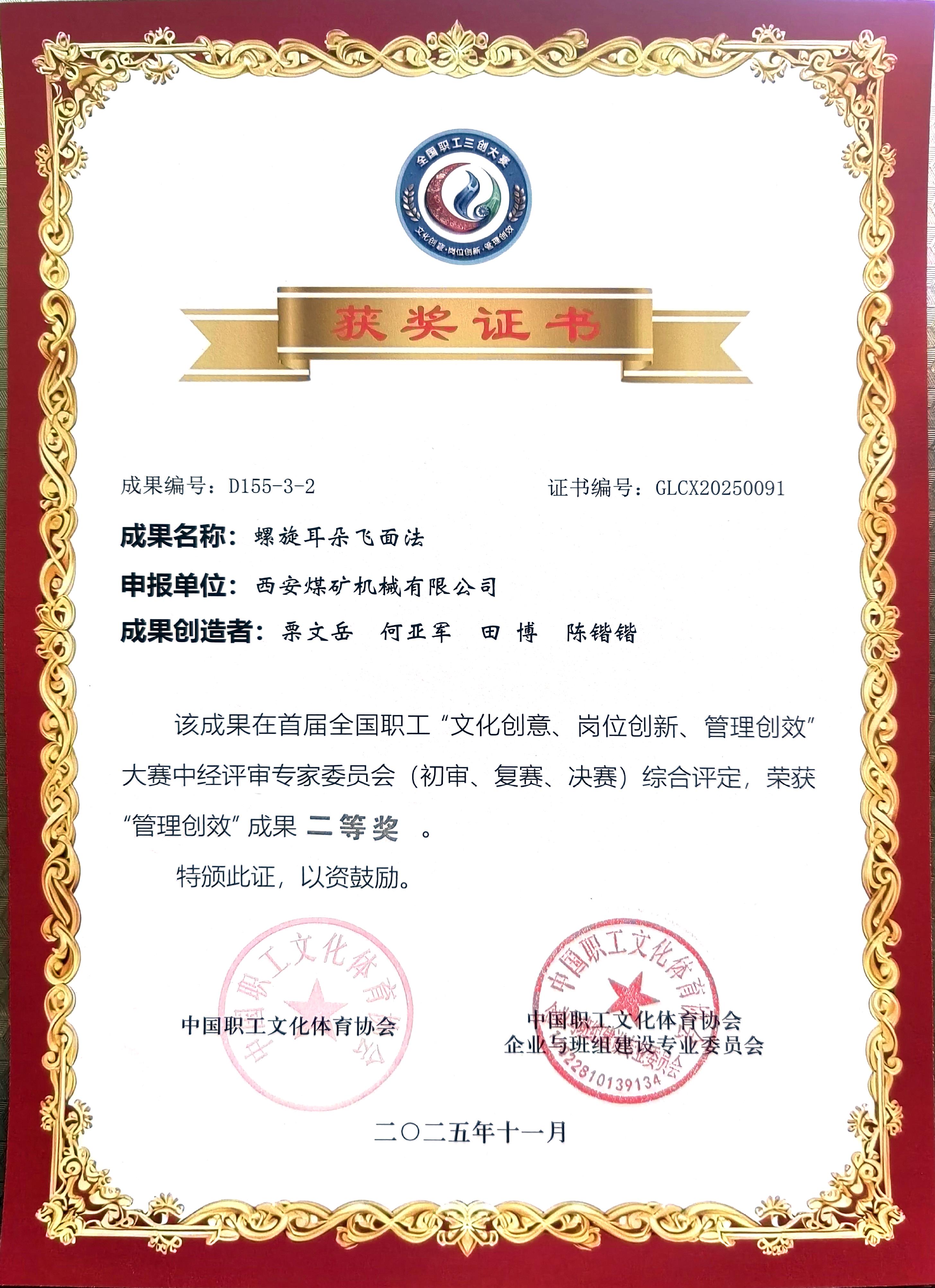 陕工网讯(郭军凤) 近日,从首都北京传来捷报——西煤机公司选送的两项创新项目在首届全国职工“文化创意、岗位创新、管理创效”大赛中脱颖而出,双双斩获“管理创效成果二等奖”,