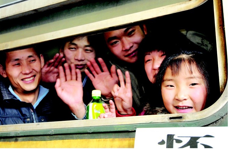昨天,来自旬阳县城关镇的赵广均 (左一)和前来西安接他的妻子 (右二)及孩子 (右一)一起坐车回家。去年他和四位工友一起在西安打工,昨天他们终于带着一年打工的辛苦钱坐上了回家的列车。迎接赵广均回家过年的妻