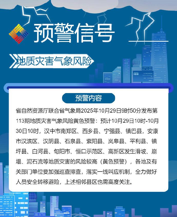 预计10月29日10时-10月30日10时,汉中市南郑区、西乡县、宁强县、镇巴县,安康市汉滨区、汉阴县、石泉县、紫阳县、岚皋县、平利县、镇坪县、白河县、旬阳市、恒口示范区、高新区发生滑坡、崩塌、泥石流等地质灾害的风险较高(黄色预警),各地及有关部门单位要加强巡查排查,落实一线叫应机制,全力做好人员安全转移避险,上述相邻县区也需高度关注。