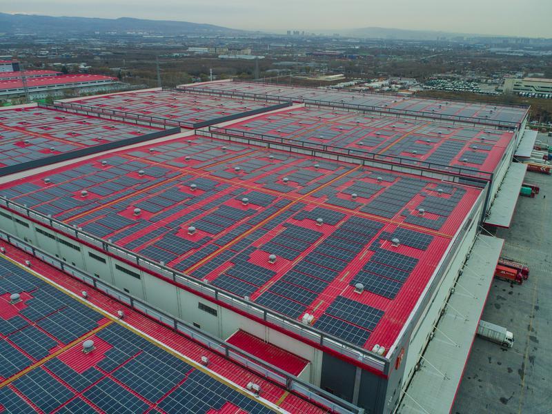 京东亚洲一号西安智能物流园区屋顶铺设的10万平方米的光伏板。