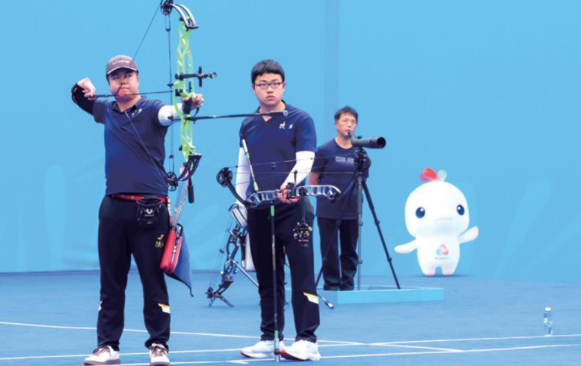 12月3日,陕西运动员冉鑫鑫、张益铖(左)在全国残特奥会射箭男子复合弓公开级团体淘汰赛比赛中。