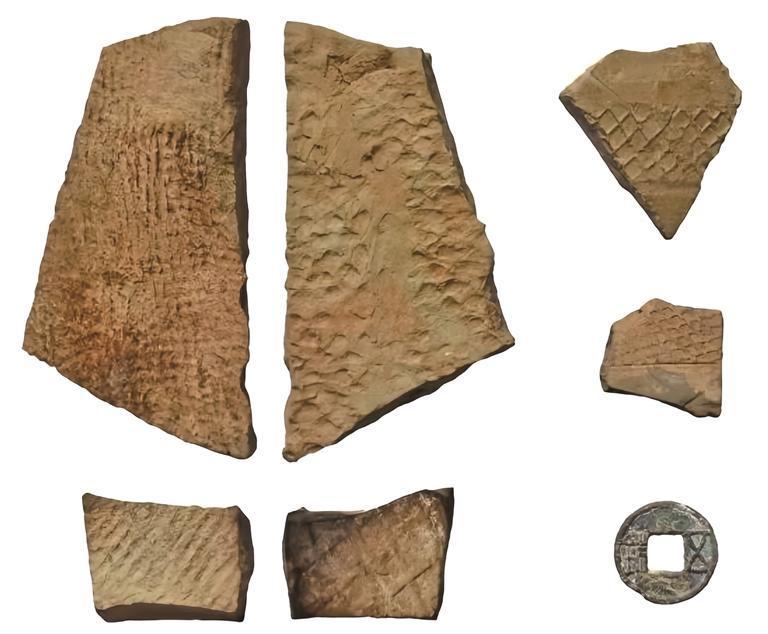 图为考古人员采集到的陶瓦片、五铢钱(资料照片)。榆林市文物保护研究所供图