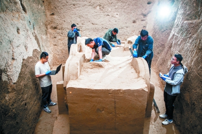 陕西省考古研究院寨沟遗址考古队在陕西清涧瓦窑沟墓地M4号墓葬清理马车(2025年9月11日摄)。