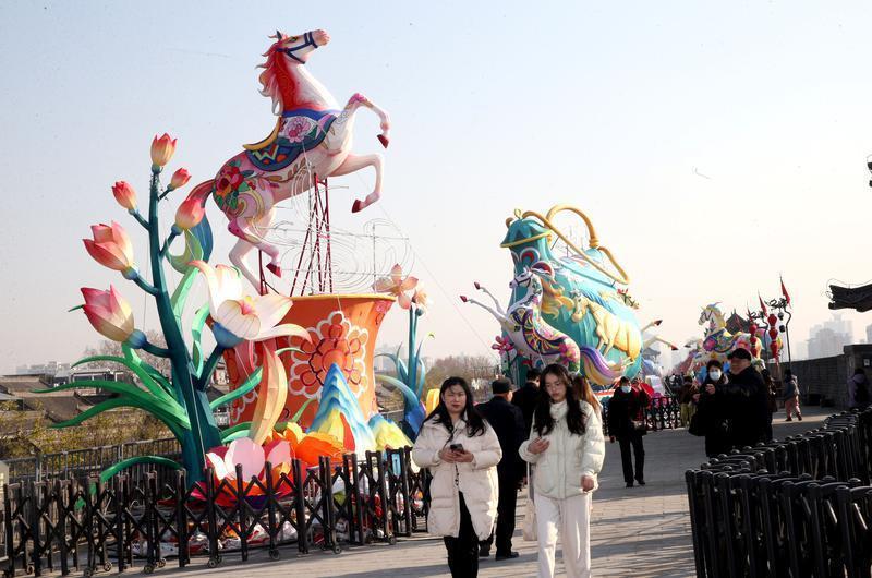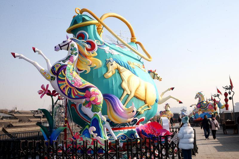 2026年恰逢丙午马年,灯会以“千灯映长安・午马迎春来”为核心主题,紧紧围绕“国宝焕新・光耀长安”这一主线,精心打造了“国宝焕新颜、诗韵长安城、奔腾生肖马”三条相互交织又各有侧重的文化脉络,让游客在赏灯之余,更能读懂长安的历史与诗意。西安城墙景区工作人员李佳洁告诉记者,“国宝焕新颜”是本届灯会的一大创新亮点。活动联合西安及关中地区多家知名博物馆,精选三彩腾空马、昭陵六骏、乾陵翼马、舞马衔杯纹银壶等50余件国宝级文物,让“深居”博物馆的历史瑰宝走出展柜、亮相城墙,成为“文物活化”的展示窗口。以匠心独运的花灯造型实现“文物复刻”,配合城角光影投影秀以及博物馆联动互动体验,构建起“文物+科技+体验”的文旅场景,将静态的历史文物转化为灵动的光影艺术,让凝固的千年文明“活”在当下,游客站在城墙之上,就能与千年国宝开启一场跨越时空的“光影对话”。