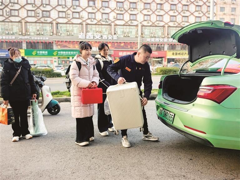 2月12日8:30,在西安沙井村附近,19岁的任福田正和母亲、妹妹站在路边,身边放着一个大号行李箱和六七个包。陕ADW8165爱心出租车司机刘飞快步上前,将行李一一搬进后备箱。往年她们坐大巴车返乡,因行李太多、母亲身体不好,全靠任福田和妹妹两人扛,到了兴平还得再换出租车才能到家,一趟下来特别折腾。