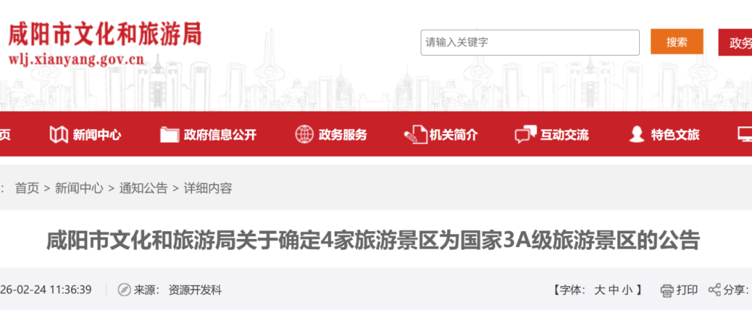 根据中华人民共和国国家标准《旅游景区质量等级的划分与评定》和《旅游景区质量等级管理办法》,经有关县文化和旅游行政部门推荐,咸阳市文化和旅游局组织综合评定并按程序完成公示,确定以下4家旅游景区为国家3A级旅游景区。名单如下: